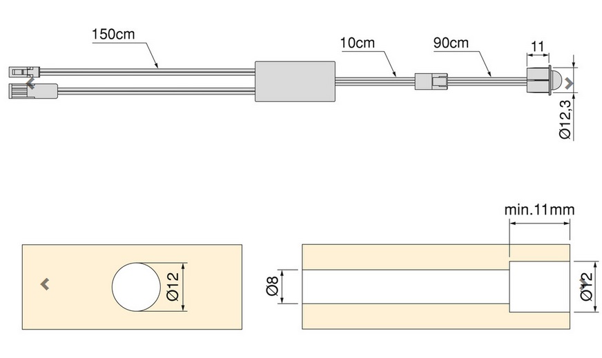 Tam ir maza izmēra galva, kas ir iebūvēta mēbelēs, ar 12 mm diametru. To var arī pieskrūvēt pie mēbeļu virsmas, izmantojot komplektā iekļauto montāžas piederumu un skrūves.
