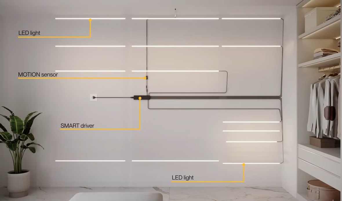 Kustības detektors, kas paredzēts 12 V vai 24 V līdzstrāvas LED gaismekļu ieslēgšanai un izslēgšanai, ideāli piemērots gaiteņiem, ģērbtuvēm, garderobēm, koridoriem un kāpnēm.