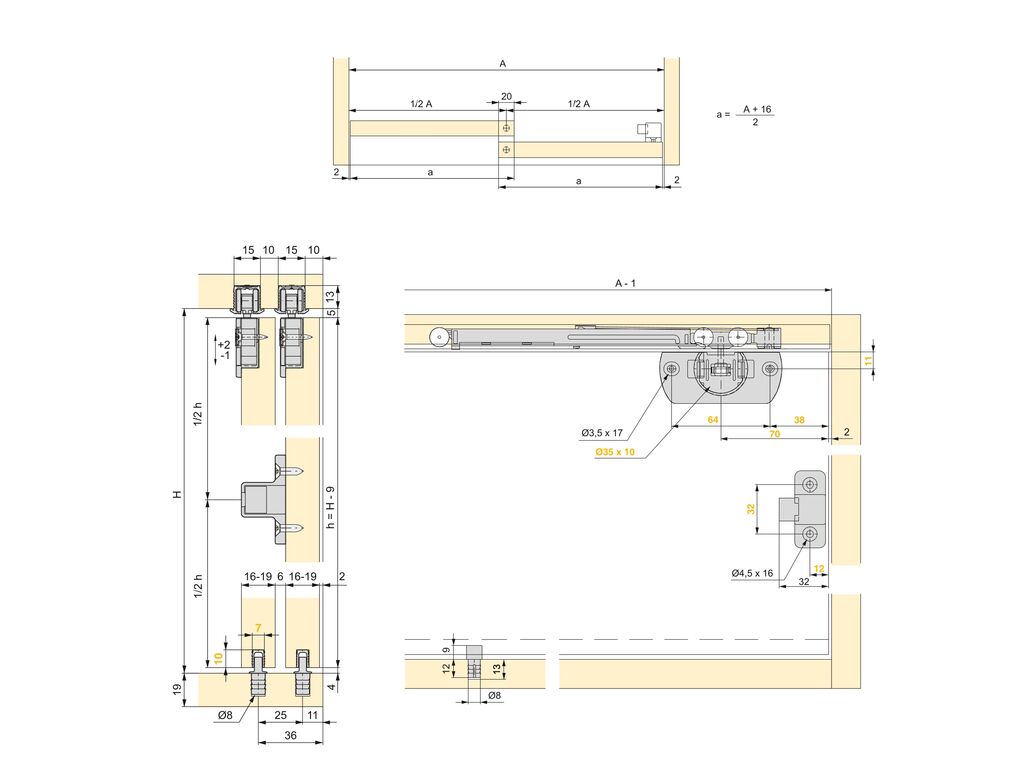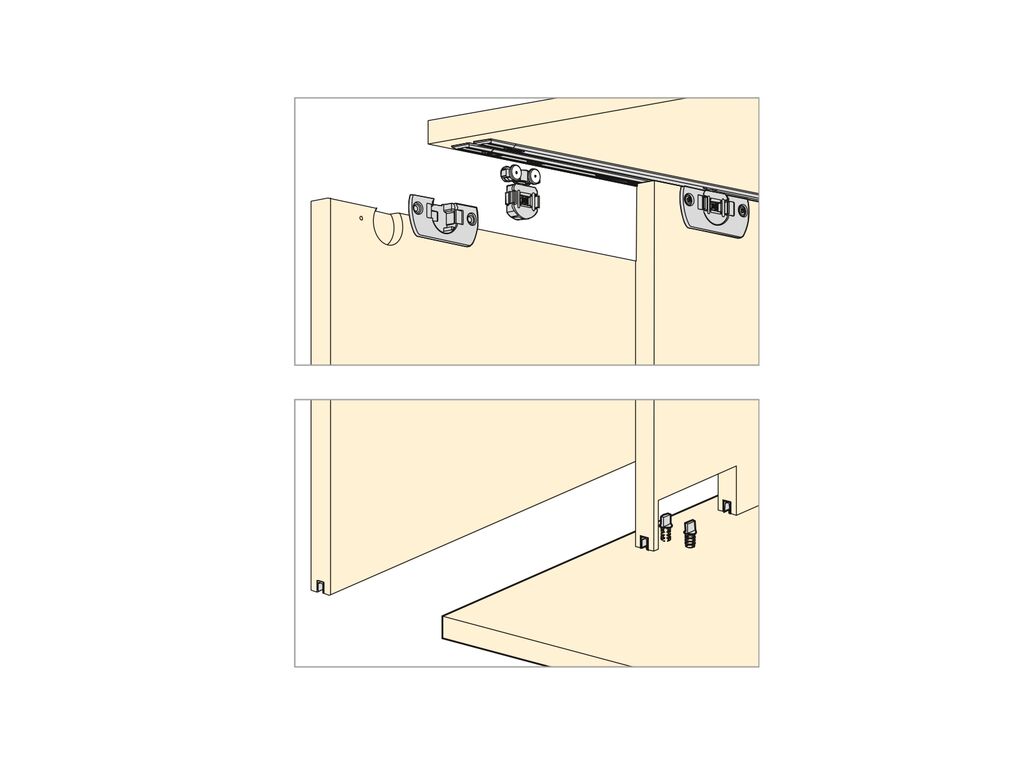 Furnit. kompl.(divām durvīm) Clipo16, biezums 16-19mm, 15kg, PlastmasaArtikuls: 6110520Krāsa: Melna Komplekts bez vadotnes un bremzes divām durvīm! |