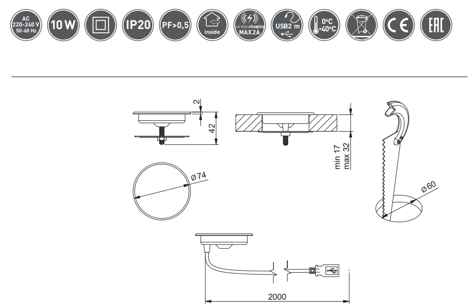 Virsmā istrādājams bezvadu ladētajs 10w, Max 2A